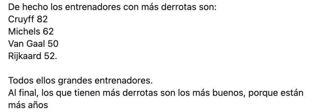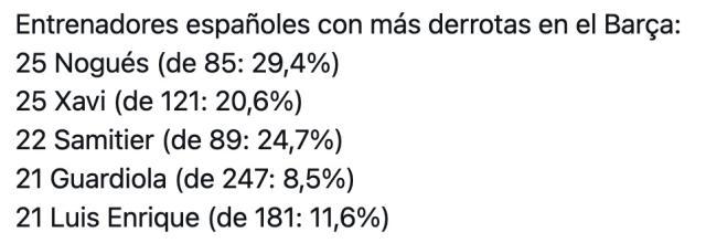 哈维执教巴萨121场,输球25次,负率达到20.6%,追平1940年代的诺格斯,并列巴萨队史输球场次最多的本土主帅。不过也有球迷质疑,只拿西班牙本土教练的成绩说事不科学,巴萨历史上输球最多的主帅是克鲁伊夫,克圣不伟大吗?只是因为执教年头长了,输球自然就更多。